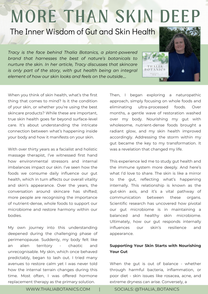 With over thirty years as a facialist and holistic massage therapist, I’ve witnessed first hand how environmental stressors and internal imbalances impact our skin. I’ve seen how the foods we consume daily influence our gut health, which in turn affects our overall vitality and skin’s appearance. Over the years, the conversation around skincare has shifted—more people are recognising the importance of nutrient-dense, whole foods to support our microbiome and restore harmony within our bodies.